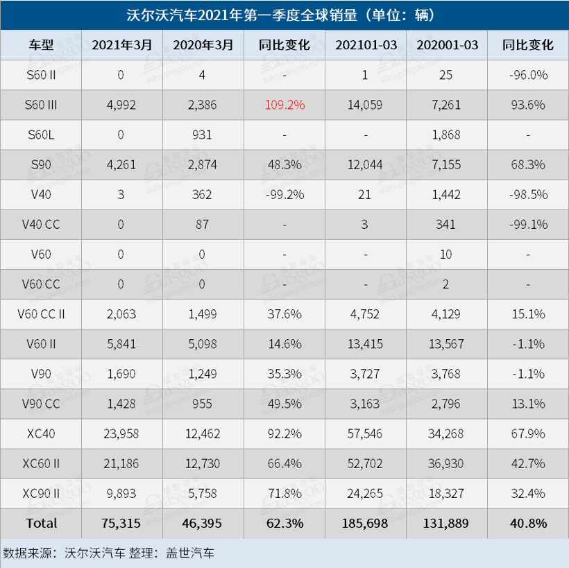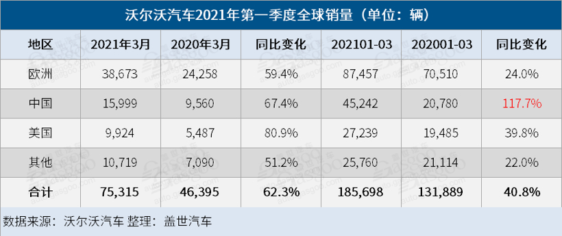 千里云途讯 根据沃尔沃汽车官方发布的销量数据,今年第一季度,该公司创下了历史同期最好的销量成绩,共在全球范围内售出185,698 辆新车,较去年同期的131,889 辆同比大涨40.8%。
