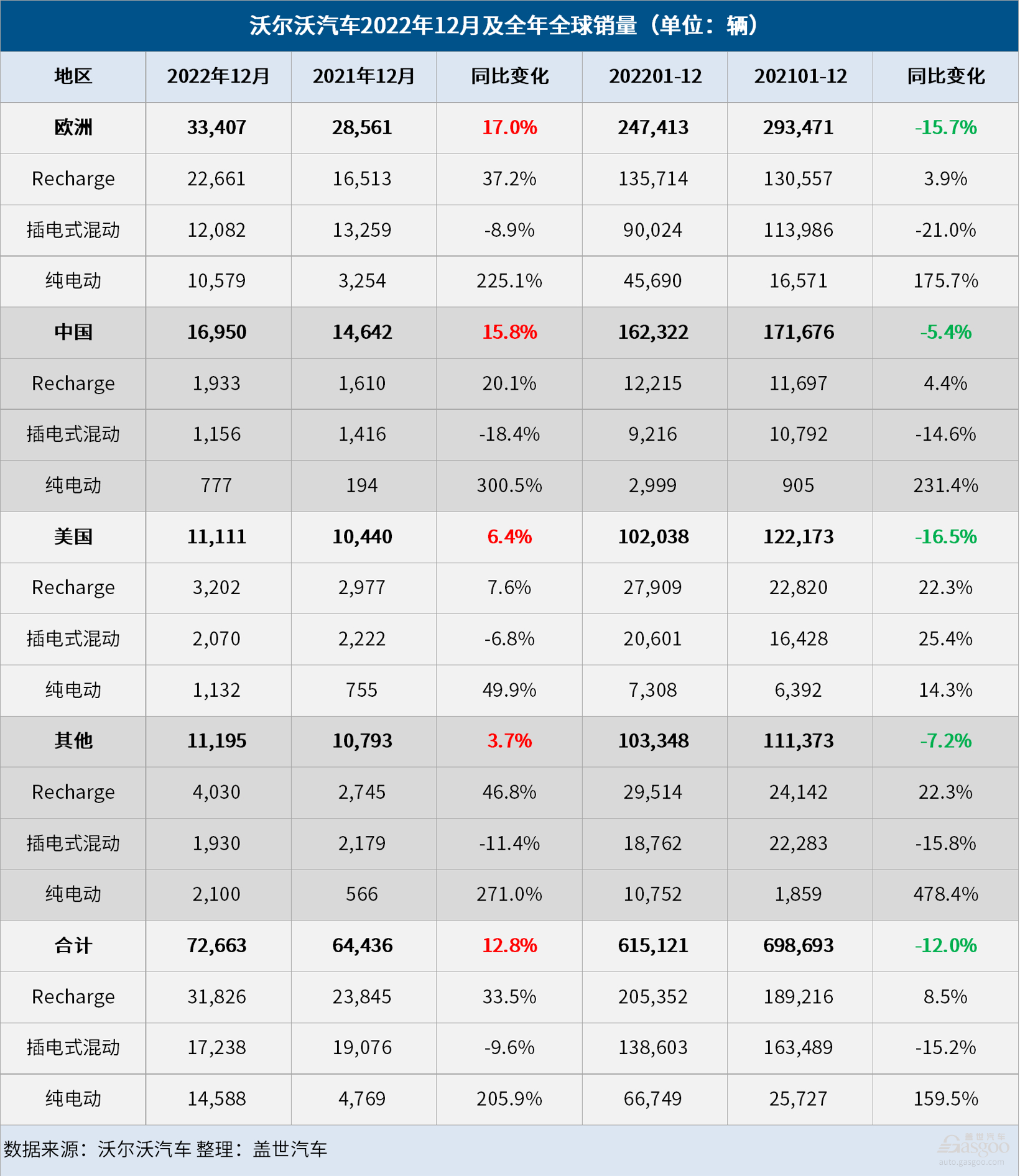 2022年12月,沃尔沃汽车在全球的销量为72,663辆,同比增长12.8%,其中Recharge车型(包括纯电动汽车和插电式混合动力汽车)的占比达到43.8%,而纯电动汽车的占比达到20.1%。