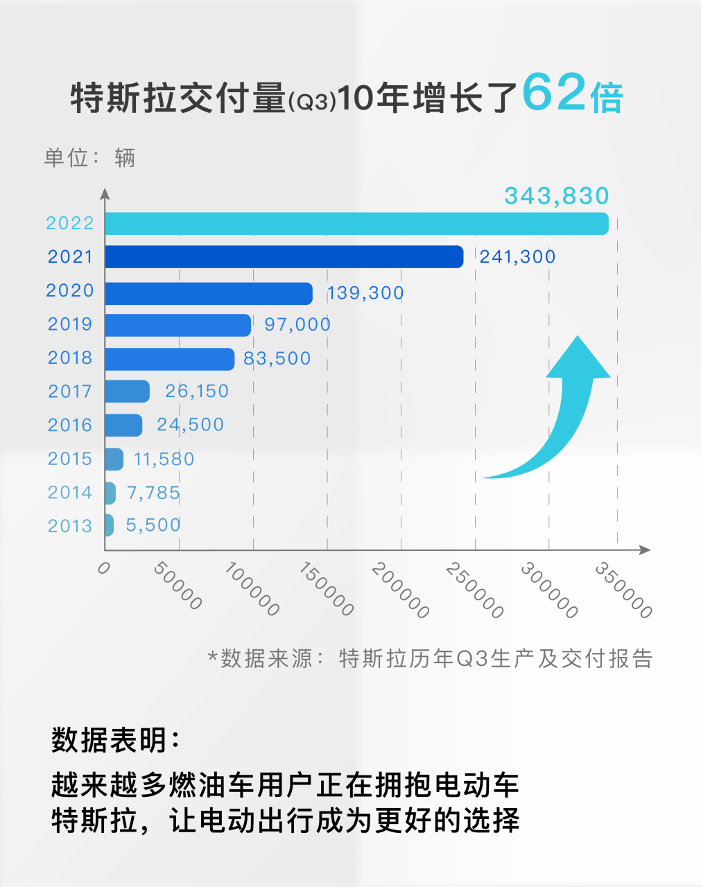 值得一提的是,根据特斯拉历年Q3生产及交付报告数据显示,自2013年至2022年,十年以来,第三季度交付量同比增长了超62倍。