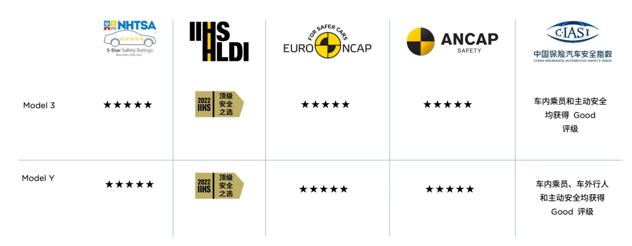 不久前,在安全评级机构Euro NCAP(欧盟新车安全评鉴协会)及ANCAP(澳大利亚新车安全评鉴协会)测试中,Model Y再度获得“五星安全”认可,至此,Model 3及Model Y在全世界主流安全评测机构的碰撞测试中,夺得五星“大满贯”。