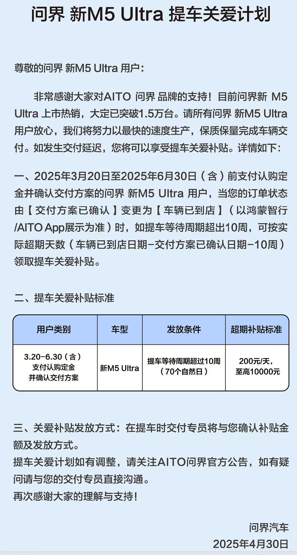 4月30日,鸿蒙智行宣布,问界新 M5 Ultra大定突破1.5万台,并发布了该车的提车关爱计划。