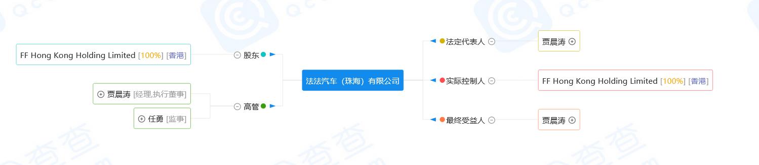 FF和珠海的联系,最早是在2020年底传出来的。企查查上的信息显示,去年12月14日,FF在珠海成立了“法法汽车(珠海)有限公司”,新公司注册资本 2.5 亿美元,法人是贾晨涛(贾晨涛也是乐视生态汽车(浙江)有限公司监事),由FF的香港实体( FF Hong Kong Holding Limited )全资持股。经营范围包含新能源汽车整车销售;新能源汽车生产测试设备销售;软件开发;智能车载设备制造等。