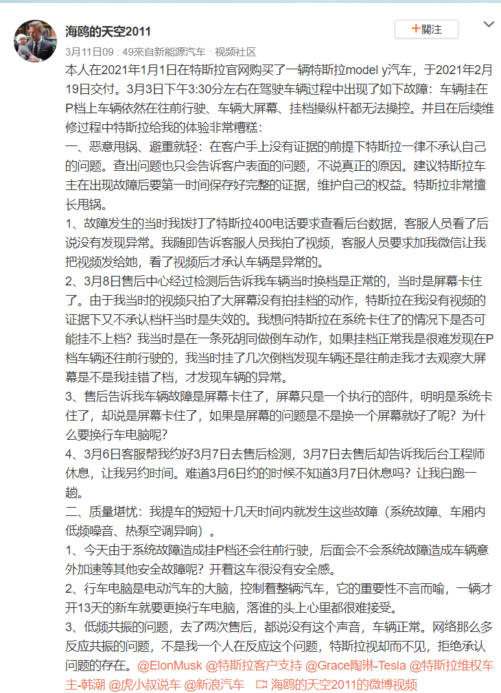 微博网友“海鸥的天空2011”在3月11日发帖表示,自己购买了一辆全新特斯拉Model Y 于2月19日交付。而就在3月3日下午,新车出现了挂P挡,仍然往前行驶的故障,同时车辆大屏幕、挂挡操纵杆都无法操控。车主还录下了当时的故障视频,并上传到了微博上。