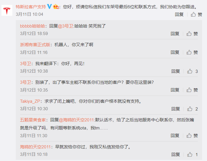 此外,特斯拉客户支持微博也向车主回应表示:“您好,烦请您私信我们车架号最后6位和联系方式,我们协助为您跟进。”而该车主对其表示,早就已经私发过了,刚又私发了一遍。