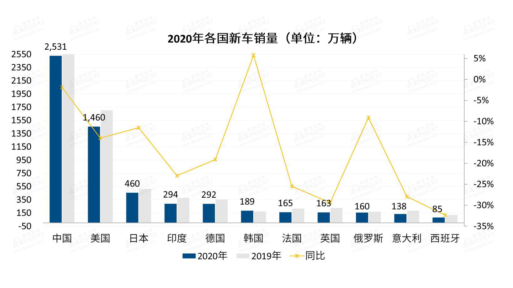 在这样的挑战下,去年12月,印度、中国、日本和德国四国销量同比实现增长;2020全年,11个国家中仅有韩国汽车销量实现上涨,印度、美国、日本、德国、法国、英国、意大利、西班牙均出现双位数下跌,而俄罗斯则因降幅较小(9.1),成功跻身全球十大汽车市场。