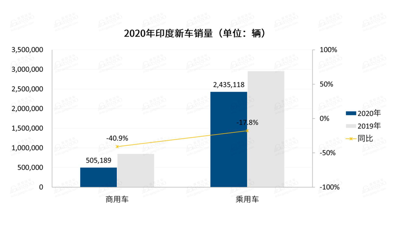 2020全年,印度汽车销量同比下跌23%,至2,940,307辆。具体来看,乘用车销量同比降低17.8%,至2,435,118辆;商用车同比降低40.9%,至505,189辆。