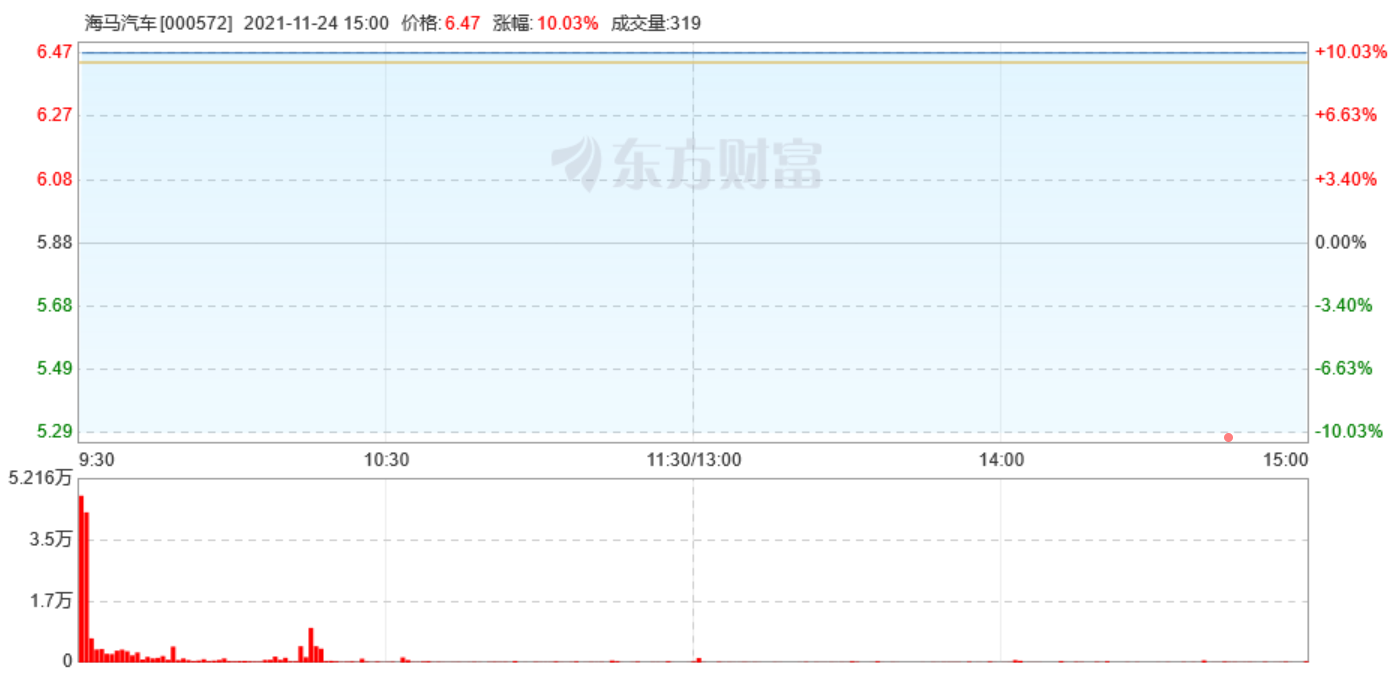 该公告发布后,11月24日,海马汽车开盘后一字涨停,当日股价报收6.47元,涨幅超过10%,最新市值106.41亿元。