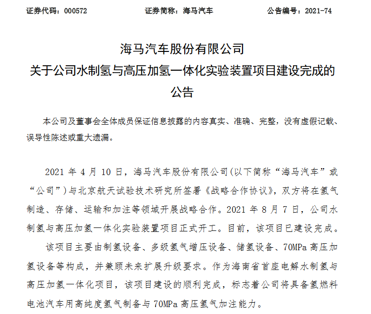 11月23日晚间,海马汽车公告,公司水制氢与高压加氢一体化实验装置项目已建设完成,标志着公司将具备氢燃料电池汽车用高纯度氢气制备与70MPa高压氢气加注能力。