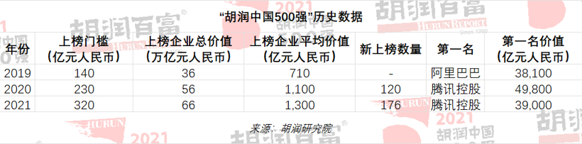 2022年1月19日,胡润研究院正式发布《2021胡润中国500强》,列出了中国500强非国有企业,按照企业市值或估值进行排名。上市公司市值按照2021年11月19日的收盘价计算,非上市公司估值参考同行业上市公司或根据最新一轮融资情况进行估算。