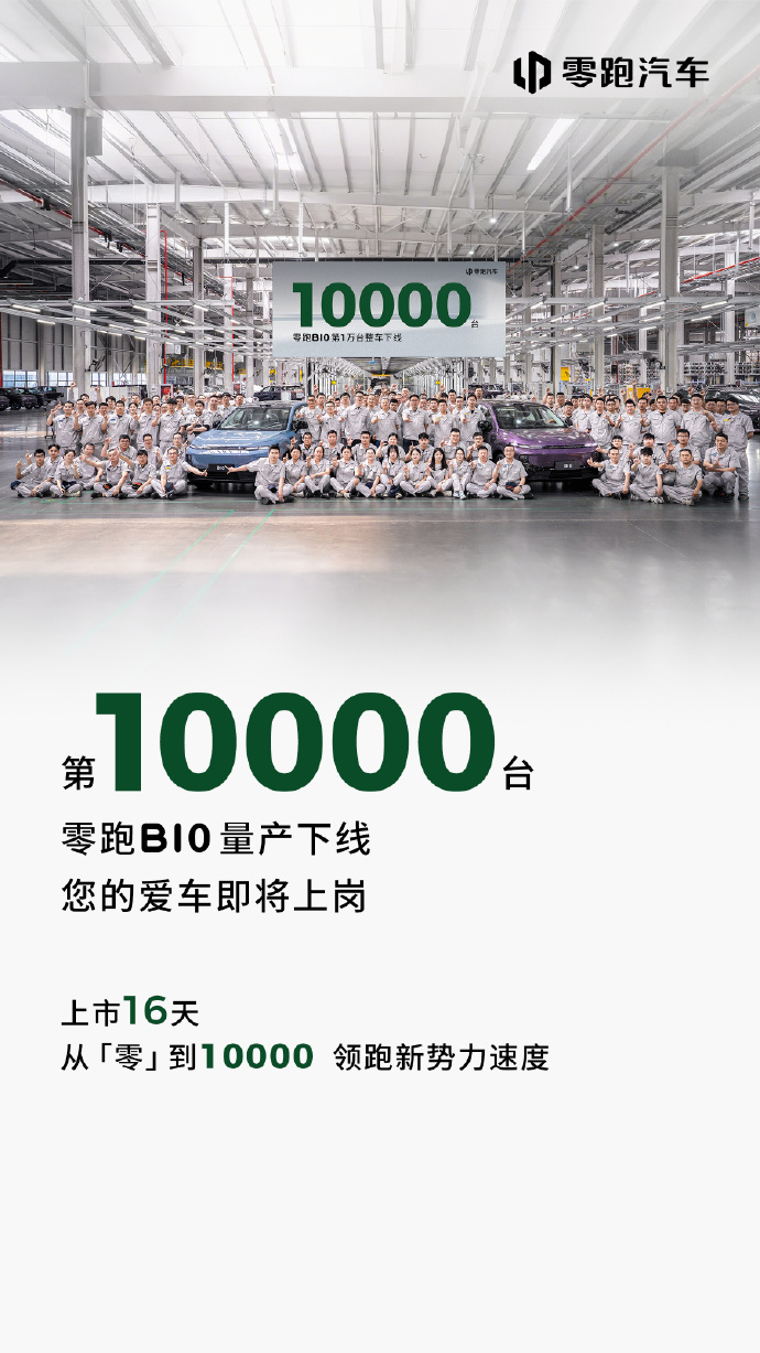4月28日晚,零跑汽车宣布,第1万台零跑B10迎来量产下线。