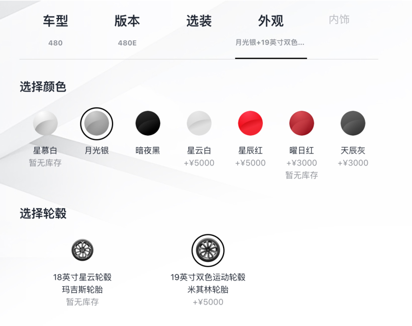 比如,目前小鹏P7在外观上有以下选装项,其中星云白、星云红颜色需要加0.5万元选装,曜日红和天辰灰则需要加0.3万元选装,轮毂升级为19英寸双色运动轮毂米其林轮胎也需要额外加0.5万元。