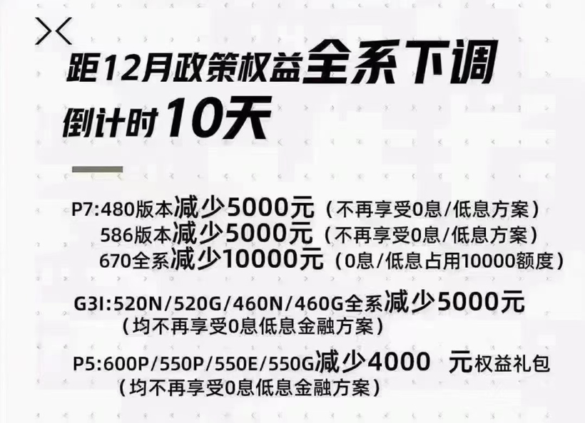 从小鹏线下门店的销售人员处得知,从12月13日起,新用户下单后的购车权益礼包和购车分期权益均会收缩。P7的购车权益礼包将减少0.5万-1万元,P5或减少0.4万元,G3i则减少0.5万元,并且大部分车型都不再享受0息或低息方案。