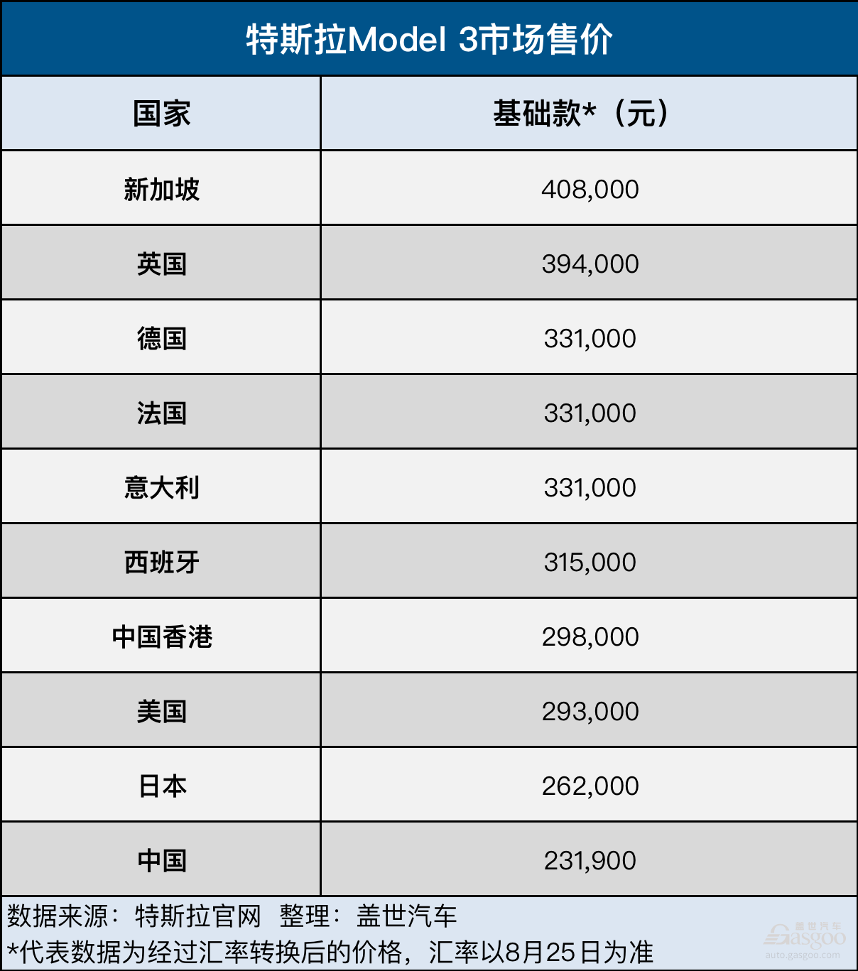 根据千里云途从特斯拉官网(截至8月25日)搜集的价格数据,在全球主要汽车市场中,特斯拉Model 3在新加坡的售价最为昂贵,在中国大陆的售价最为便宜。