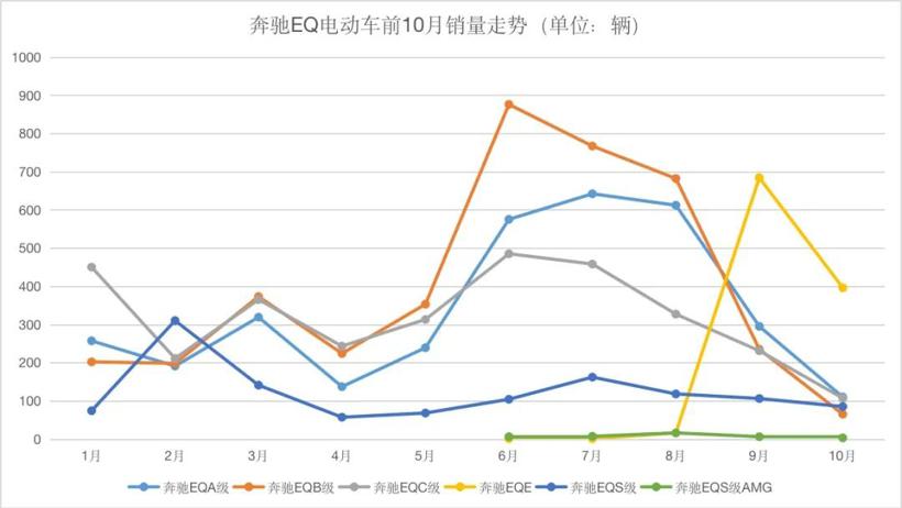 即便如此,EQA和EQB的市场表现仍旧不尽如人意,今年的月均销量和EQC差不多同水平,EQB在10月的销量甚至低至百辆以下。