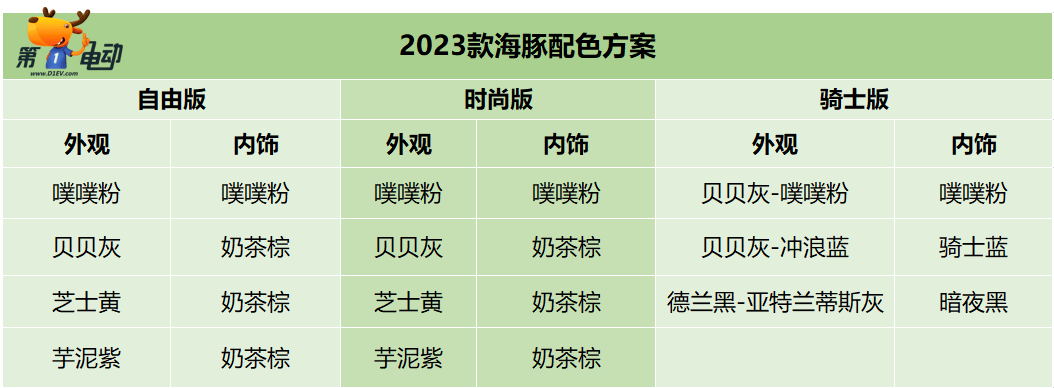 内饰色调上,“噗噗粉”纯色车身采用了与外观色调一致的颜色,其余纯车色均采用“奶茶棕”内饰。骑士版“粉海豚”和“蓝海豚”的内饰颜色保持不变。